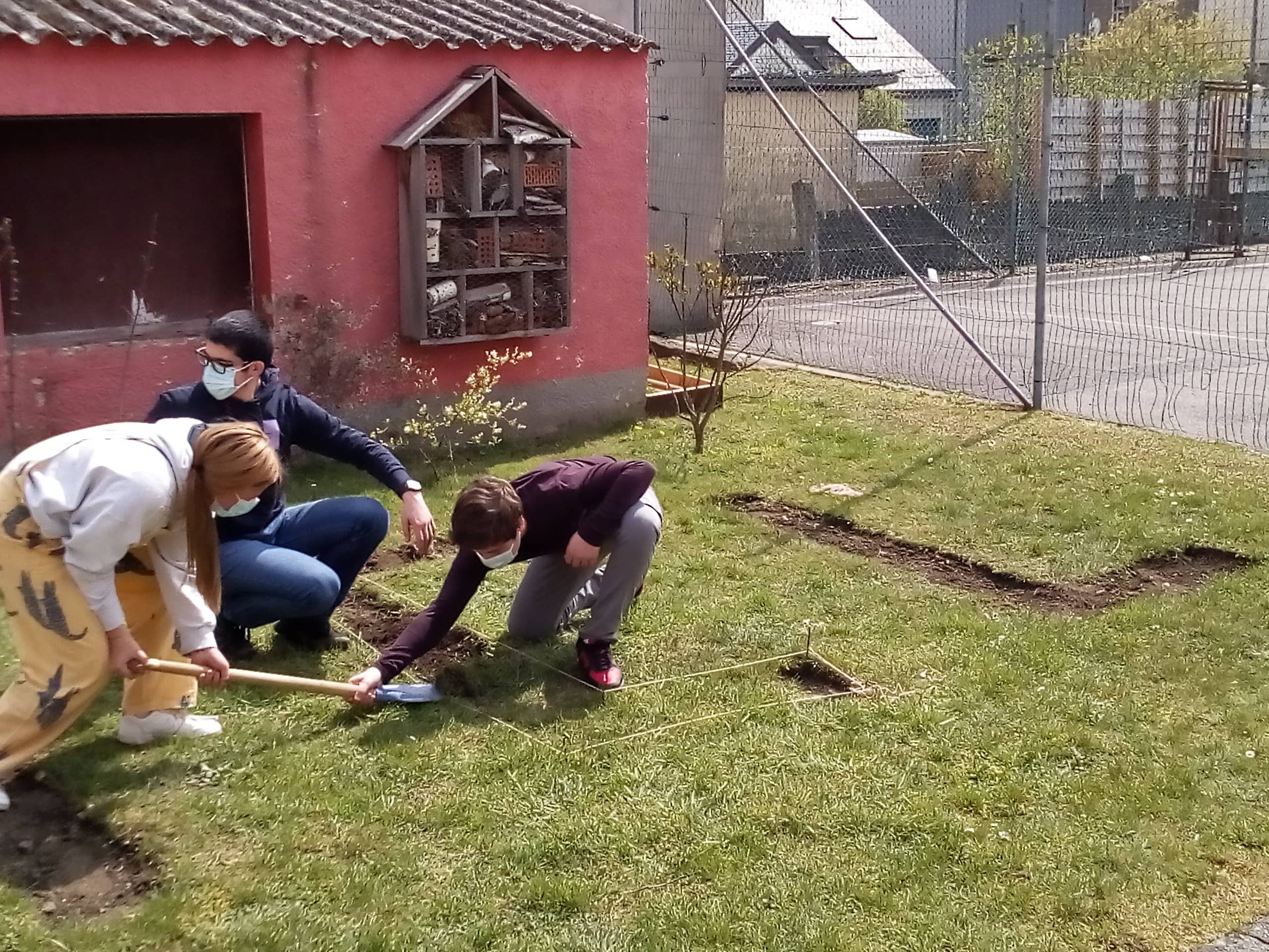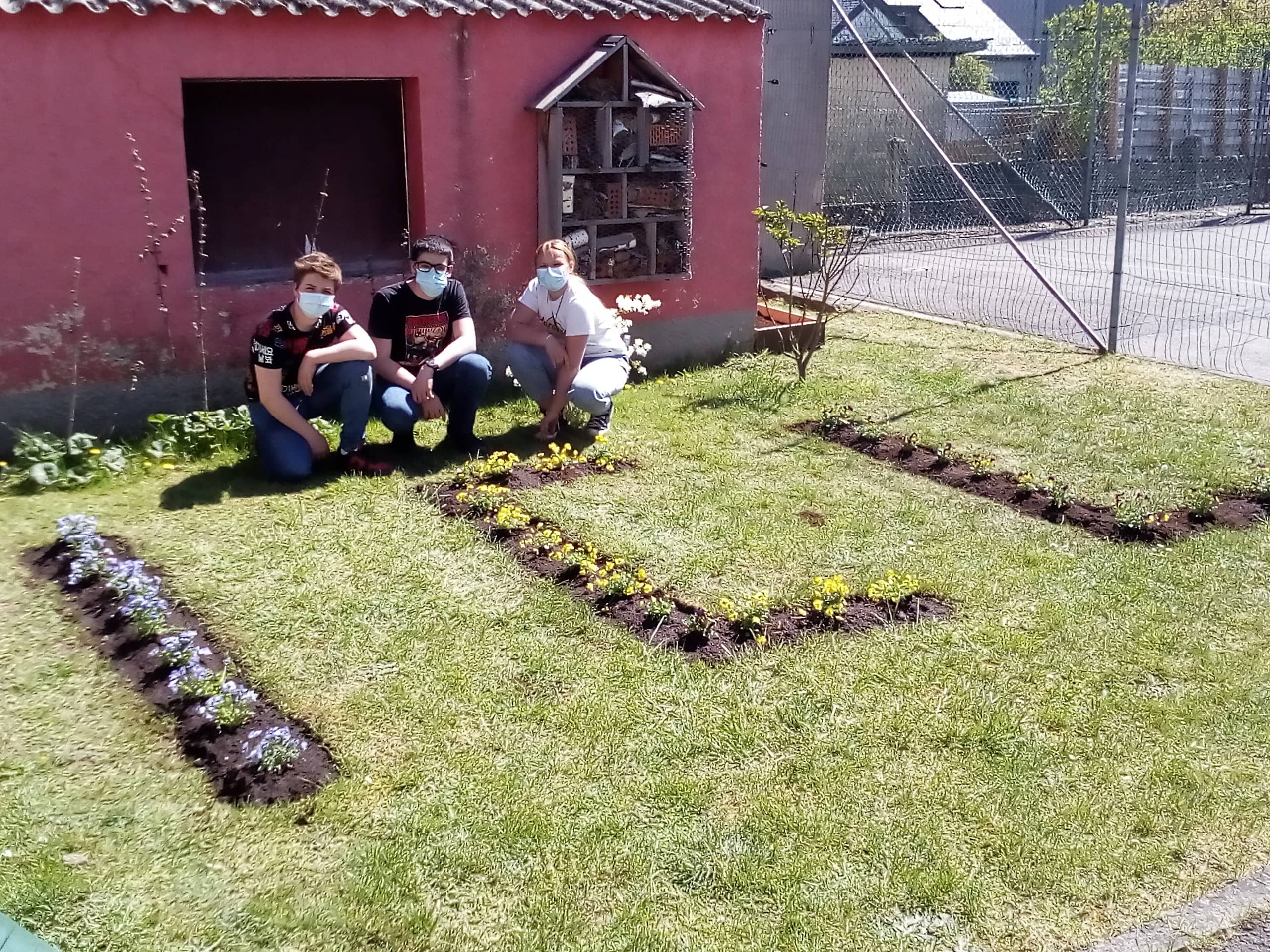 Après avoir délimité, tracé, dégazonné, bêché, enrichi l’espace travaillé avec les conseils du professionnel J-P SAND de Messancy, nos trois jardiniers ont coloré l’ICL de jolies pensées.